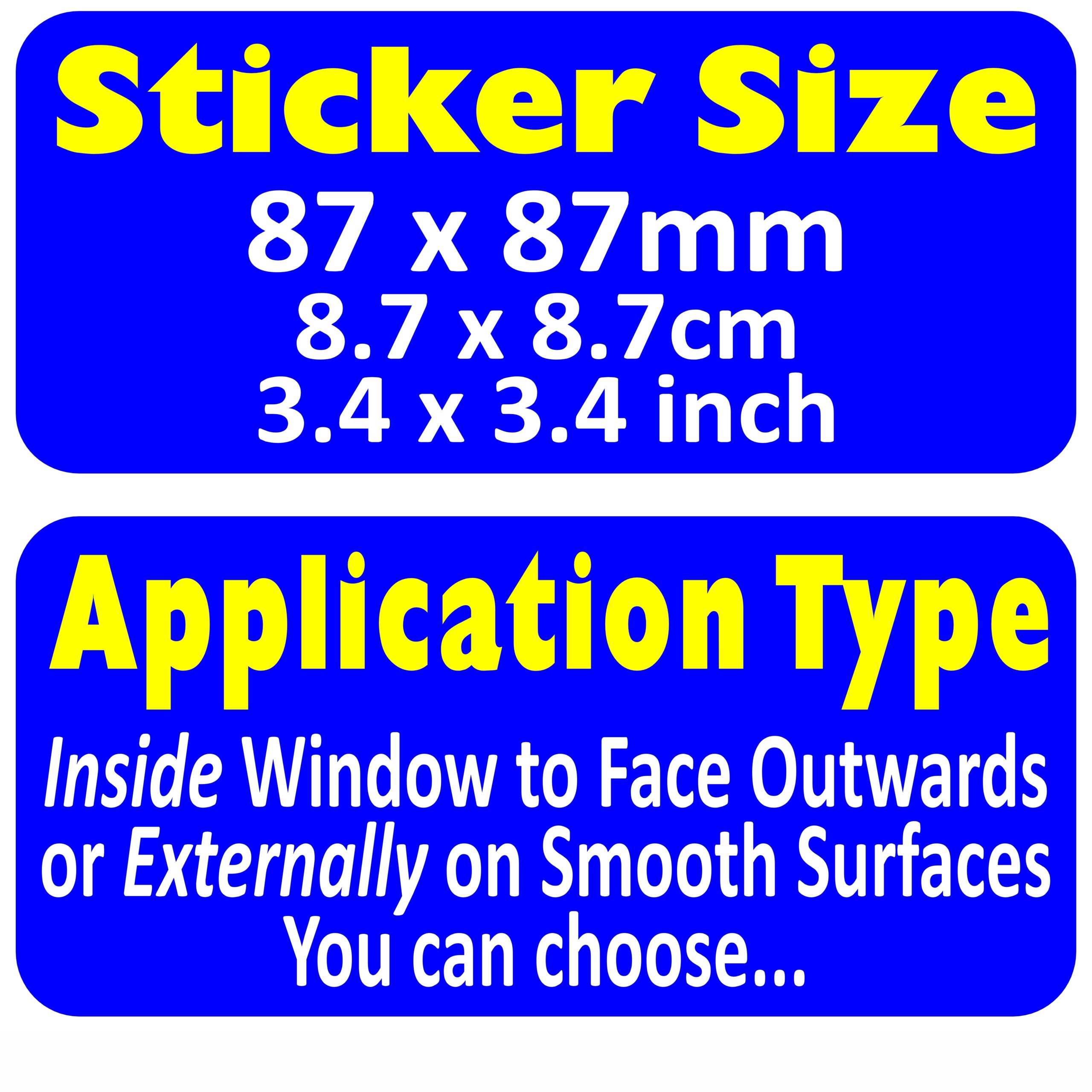 This self adhesive sticker is printed with specialist UV inks onto professional sign vinyl material. This makes our stickers UV resistant so they will not fade in sunlight and also are waterproof, scratch resistant. This allows the sticker to be applied either to the inside of a window to face outwards, or externally to smooth surfaces. Stickers applied outside to an external surface are also weather resistant.